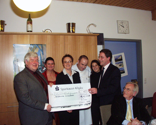 Unser Bild zeigt den Kreisvorsitzender der Europa Union Oberallgäu, Harald Voigt (rechts) bei der Scheckübergabe an Manfred Ecker (links) und Nadine Nusser (2.v.l) von der Berufsschule Immenstadt zusammen mit den Vertretern aus Arcachon.