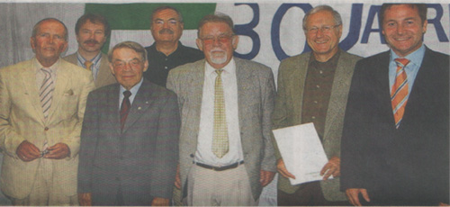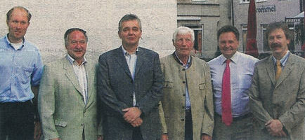 Nach der Ehrung der Gründungsmitglieder im Bild von links: EU-Kreisvorsitzender Hartwig Seebauer,EU-Bezirksvorsitzender Dr.Gerhard Böck, Otto Meyer, Dr.Georg Barfuß, Josef Moll, Hubert Probst und Landrat Leo Schrell.